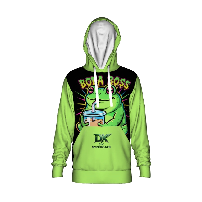 Bluza z kapturem BOBA BOSS od DK Syndicate to streetwearowa bluza inspirowana kulturą bubble tea i humorem pop street. Grafika żaby z kubkiem boba nadaje projektowi zabawny, nowoczesny charakter idealny do codziennych stylizacji. Miękka bawełna i wygodny krój zapewniają komfort oraz swobodę noszenia.
