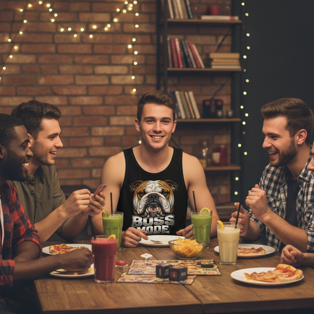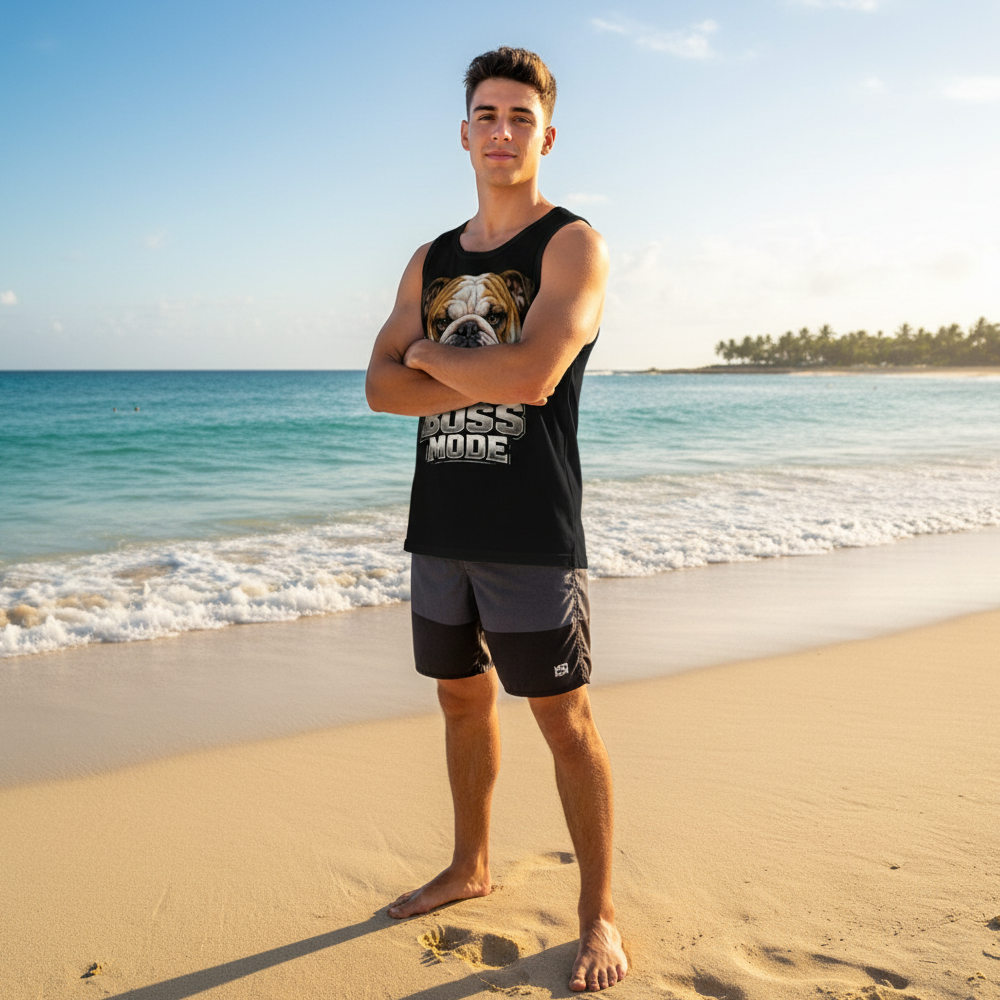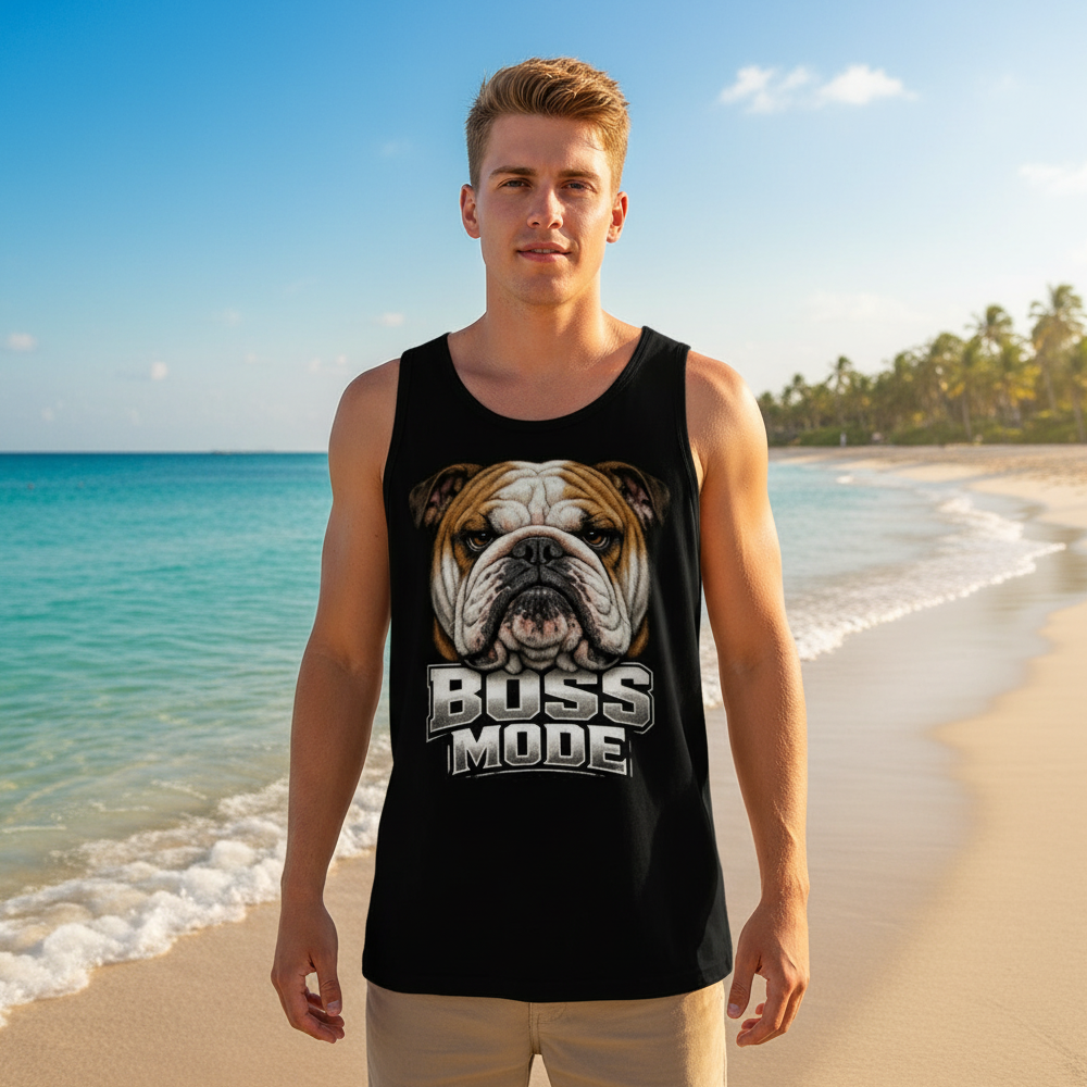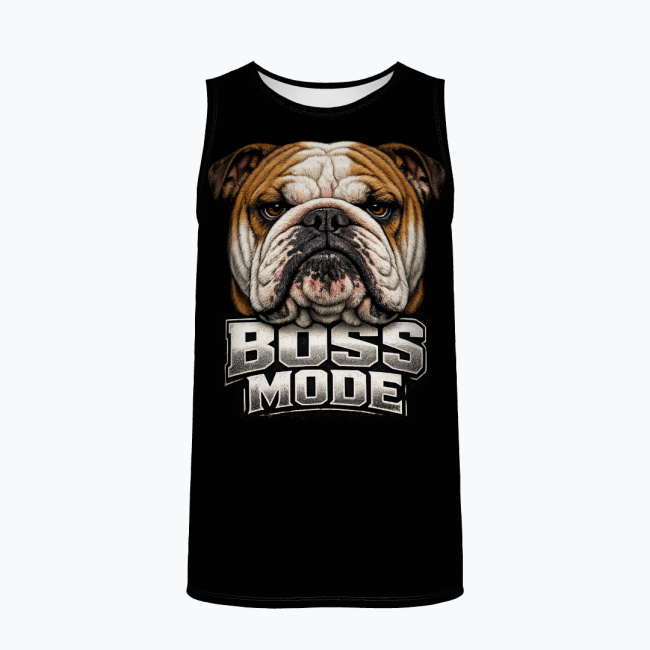 Koszulka bez rękawków BOSS MODE od DK Syndicate z grafiką buldoga i mocnym hasłem. Full color DTG placement print zapewnia trwałość i wysoką szczegółowość nadruku. Styl streetwear o silnym charakterze.