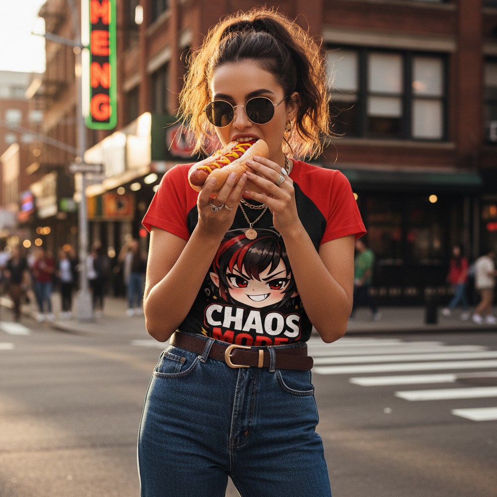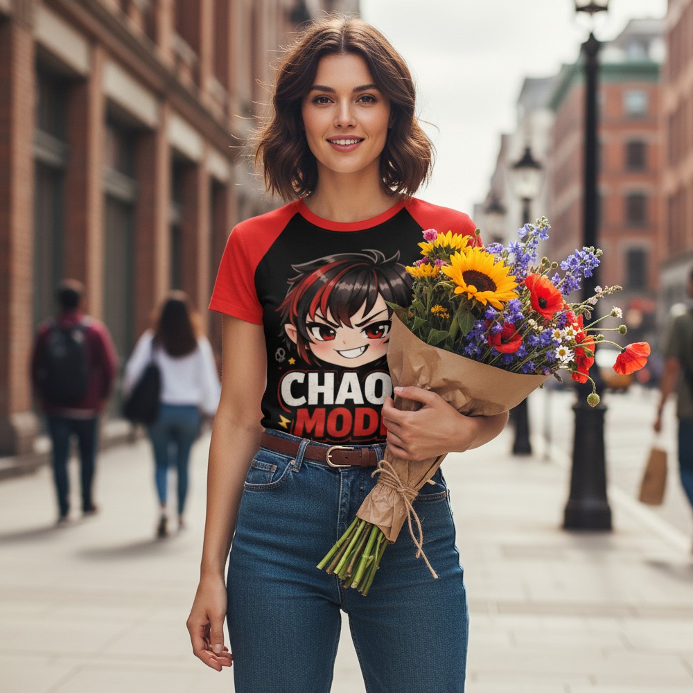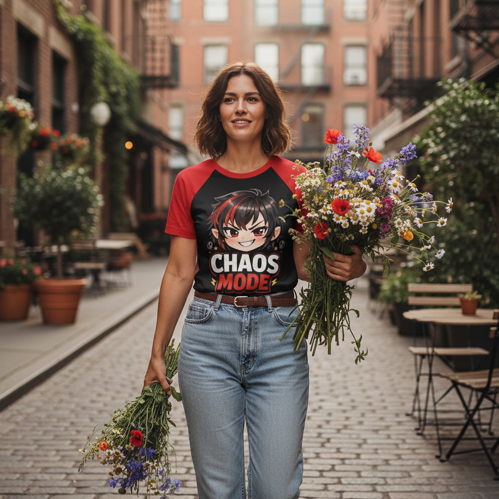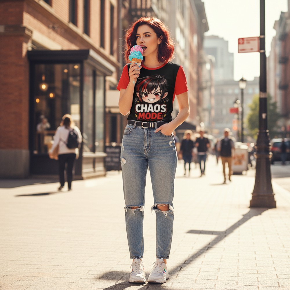 Niektóre dni mają własne zasady. CHAOS MOOD to koszulka dla tych momentów, kiedy energia jest nieprzewidywalna, a charakter mówi sam za siebie. Na froncie pojawia się dynamiczna postać w stylu anime z napisem CHAOS MODE, który podkreśla buntowniczy, lekko prowokacyjny vibe. Intensywne kolory czerwieni i czerni tworzą mocny kontrast i przyciągają uwagę. Tył koszulki przedstawia graficzną, ekspresyjną gwiazdę z napisem MOOD, która symbolizuje emocje i humorystyczne podejście do codzienności. Całość tworzy spójny, pop-kulturowy klimat inspirowany stylem kawaii i anime. Szeroki dekolt nadaje koszulce lekkości i nowoczesnego charakteru, dzięki czemu świetnie sprawdza się w codziennych stylizacjach.To pancerz dobrego chaosu.