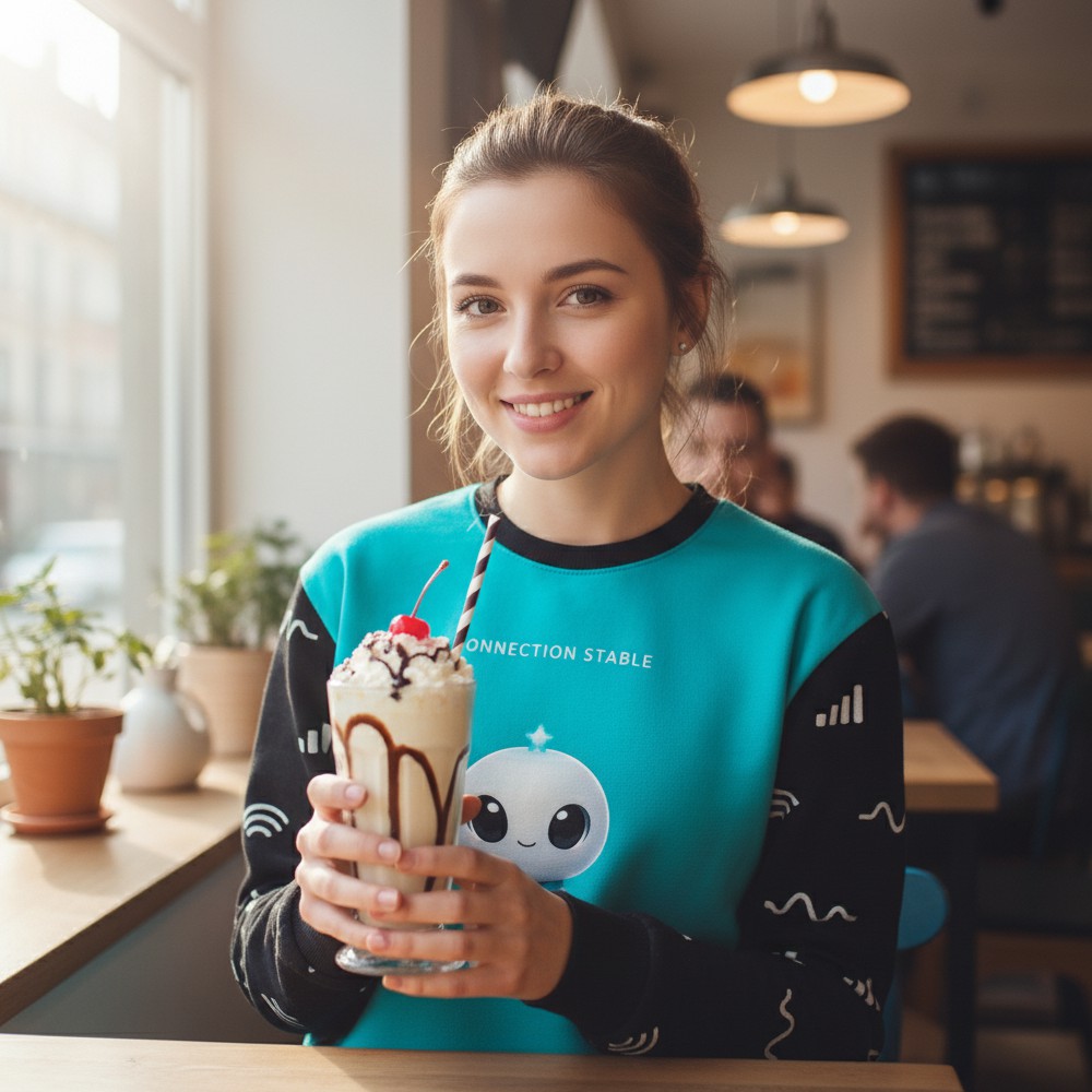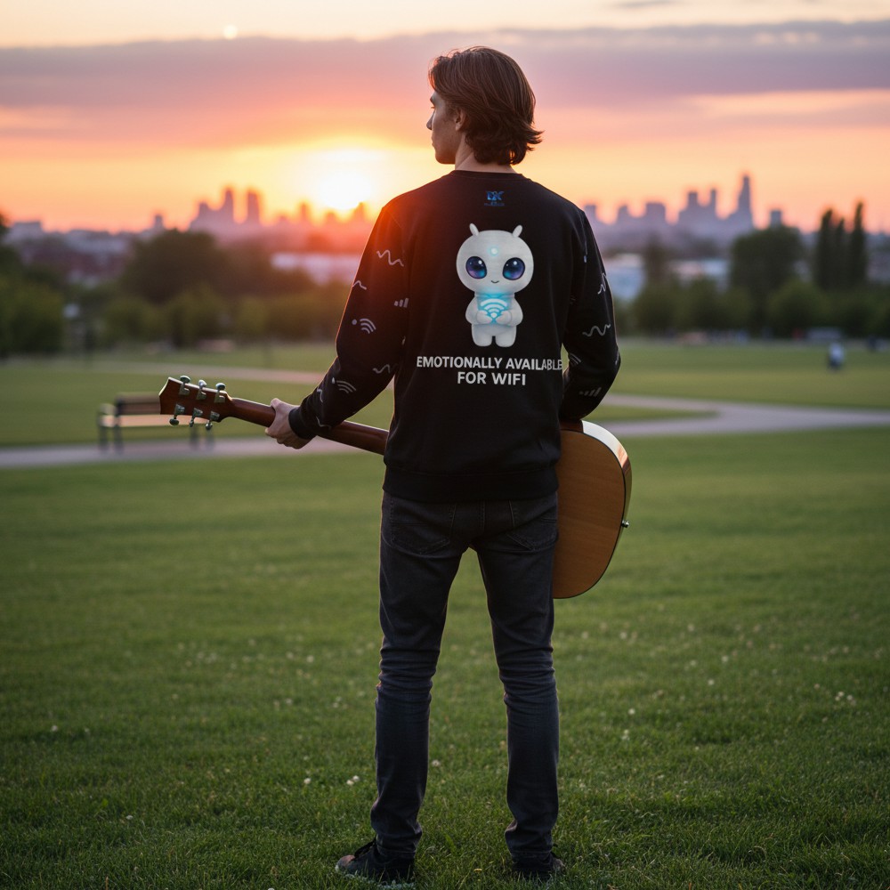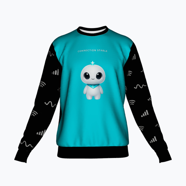 Stabilne połączenie to dziś luksus. CONNECTION STABLE łączy humor technologiczny z lekką, futurystyczną estetyką. Urocza postać inspirowana światem AI symbolizuje potrzebę autentycznego kontaktu – zarówno online, jak i offline. Kontrast turkusowego frontu z graficznymi rękawami nadaje projektowi nowoczesny, cyfrowy charakter. Idealna bluza dla osób, które funkcjonują w świecie technologii, ale cenią prawdziwe emocje. Połączenie ma znaczenie.