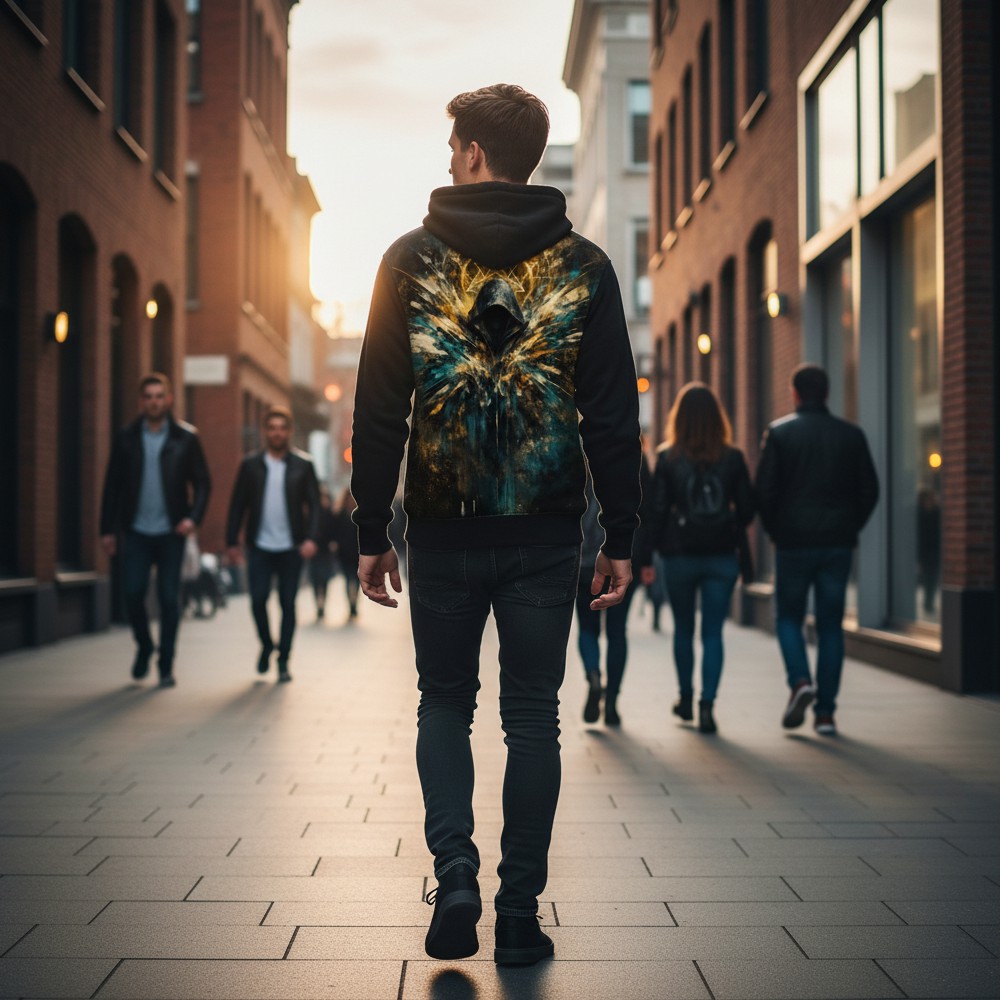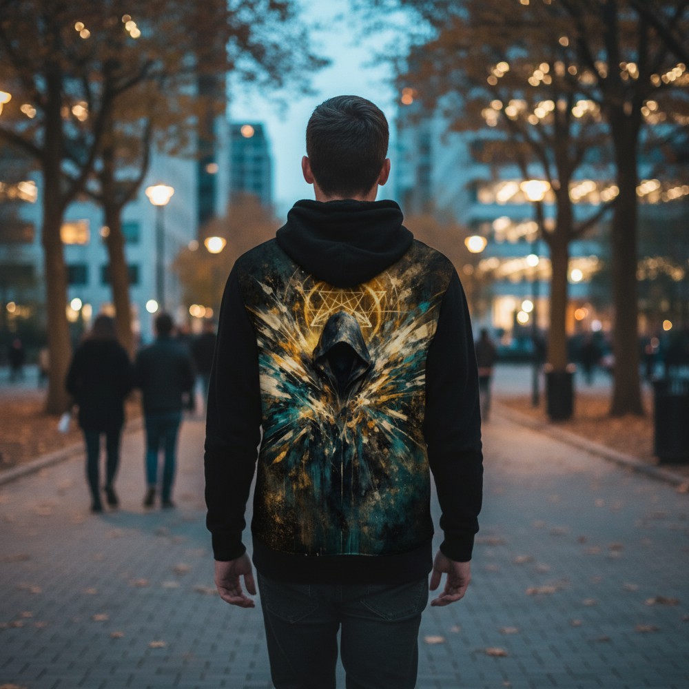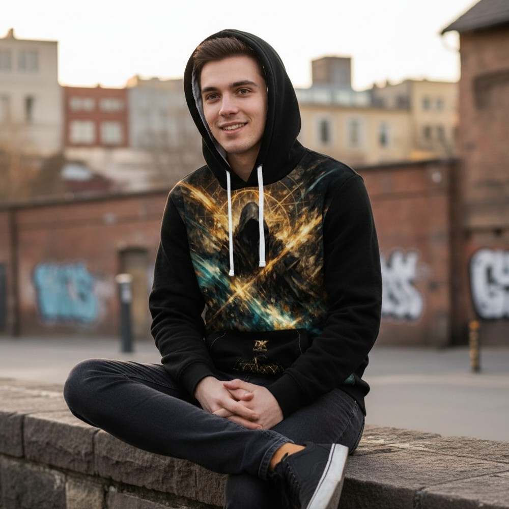 Nowoczesna duchowość w cyfrowej formie. DIGITAL SHAMAN łączy symbolikę energii, świadomości i technologii, tworząc projekt o mistycznym, futurystycznym charakterze. Postać w kapturze otoczona geometrycznymi znakami podkreśla motyw transformacji, intuicji i wewnętrznej siły. Połączenie czerni z energetycznymi akcentami złota i chłodnych tonów nadaje projektowi głębię oraz hipnotyzujący klimat. To styl dla osób, które szukają znaczeń poza schematem i cenią symbolikę połączoną z nowoczesną estetyką. Technologia spotyka świadomość.