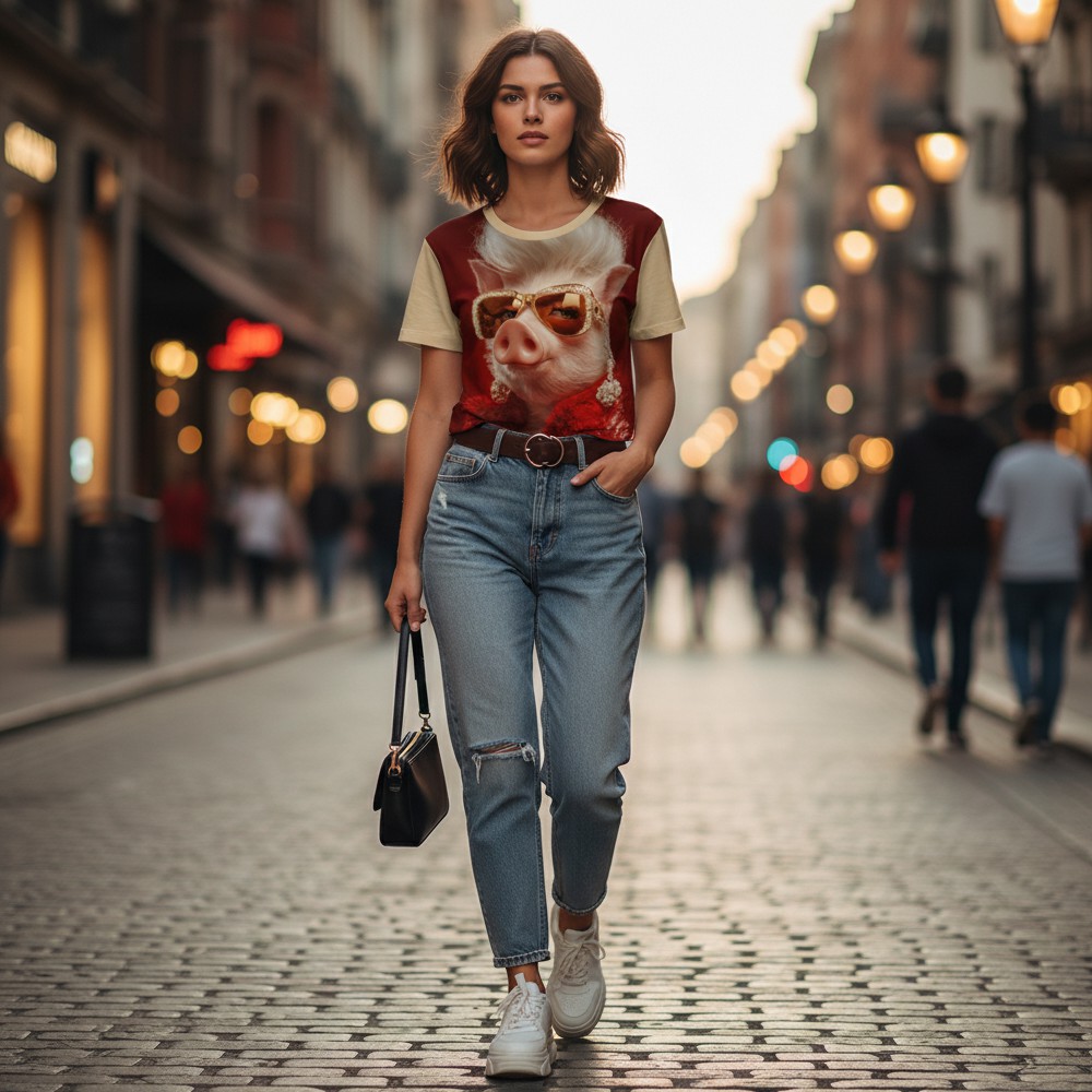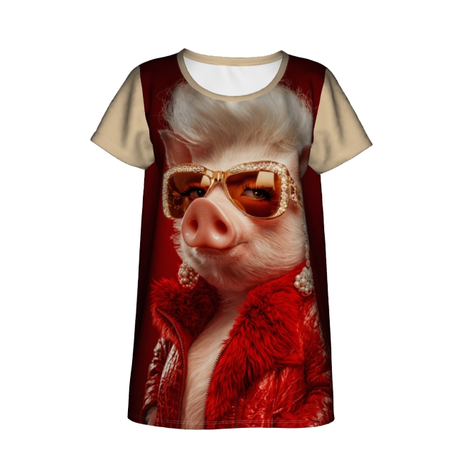 Nie każdy pancerz powstaje do walki. Niektóre są stworzone po to, żeby błyszczeć. GLAM PIG to koszulka dla tych, którzy wiedzą, że styl, dystans do siebie i odrobina luksusowego humoru potrafią zrobić większe wrażenie niż najpoważniejsza mina. Na froncie tego błyszczącego pancerza glamour pojawia się prawdziwa gwiazda sceny — elegancka świnka w kryształowych okularach, czerwonym futrze i stylizacji, która wygląda jak prosto z wybiegów mody. Złote refleksy, ciepłe światło i pewne siebie spojrzenie tworzą portret bohaterki, która doskonale wie, że czasem najlepszą strategią jest po prostu wyglądać świetnie. Tył koszulki podkreśla cały charakter projektu. Na intensywnie czerwonym tle pojawiają się luksusowe okulary wysadzane kryształami oraz napis GLAM PIG — prosty, ironiczny manifest stylu dla tych, którzy lubią modę z przymrużeniem oka. Lekka dzianina i szeroki dekolt sprawiają, że ten pancerz modowego luzu jest wygodny, kobiecy i idealny na każdą okazję, w której chcesz błyszczeć.