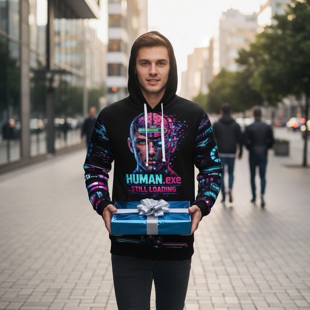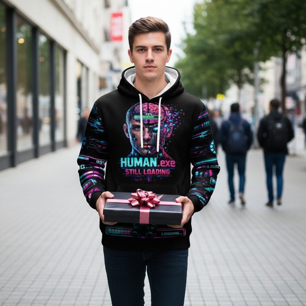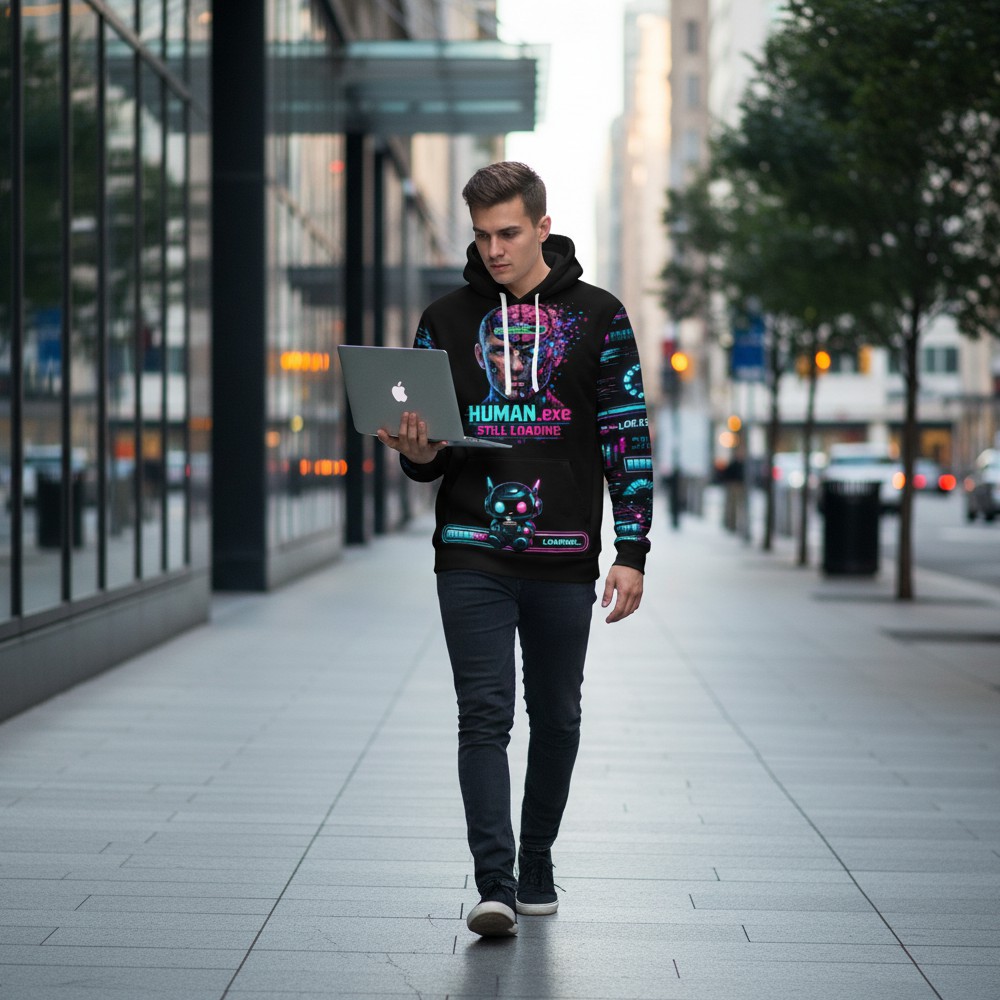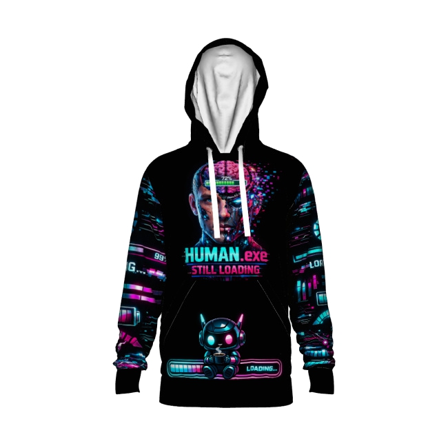 Niektóre aktualizacje nigdy się nie kończą. HUMAN STILL BETA to bluza dla tych, którzy wiedzą, że człowiek – tak jak technologia – cały czas się rozwija, uczy i przechodzi kolejne wersje. Na froncie tego futurystycznego pancerza cyfrowej tożsamości pojawia się motyw technologicznego interfejsu z napisem HUMAN STILL BETA oraz neonową grafiką inspirowaną światem AI. Całość wygląda jak ekran systemowy przyszłości, w którym człowiek i technologia zaczynają działać na wspólnych zasadach. Tył bluzy rozwija tę koncepcję w formie cyfrowego panelu aktualizacji. Wśród neonowych interfejsów i ikon pojawia się hasło SYSTEM UPDATE: HUMANITY, które wygląda jak komunikat z przyszłości przypominający, że rozwój człowieka wciąż trwa. Miękka materiał, kaptur i wygodny krój sprawiają, że ten pancerz technologicznego dystansu idealnie sprawdza się w codziennym stylu, szczególnie dla tych, którzy lubią futurystyczny klimat i inteligentny humor.