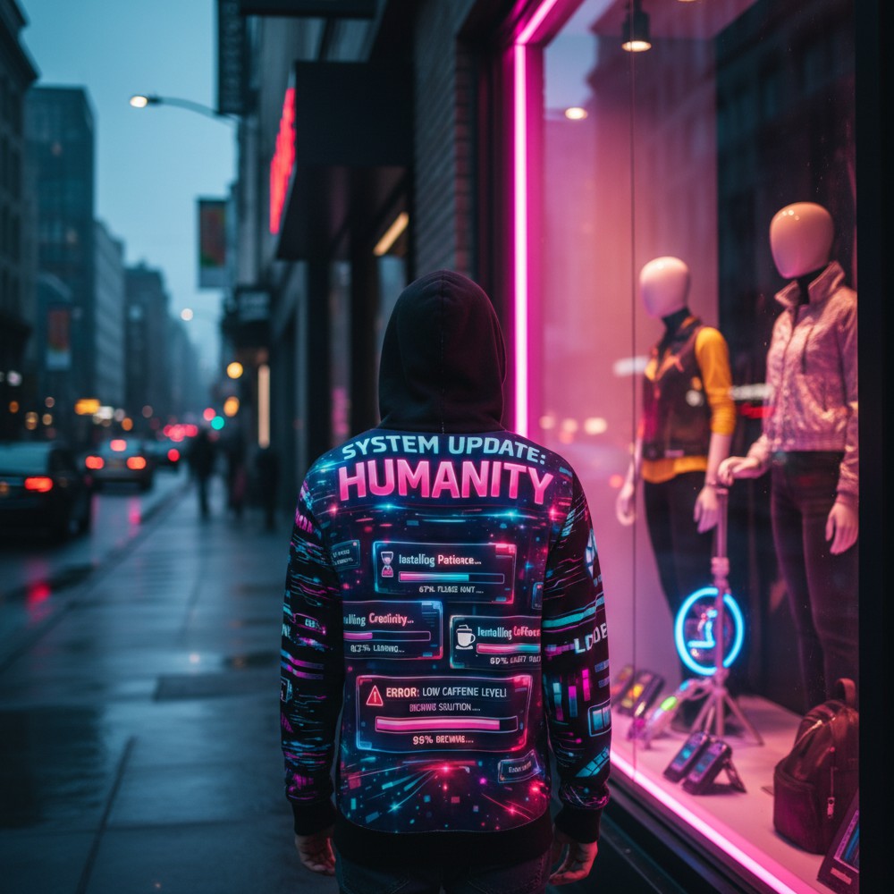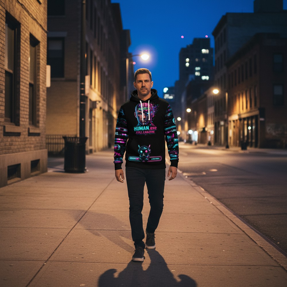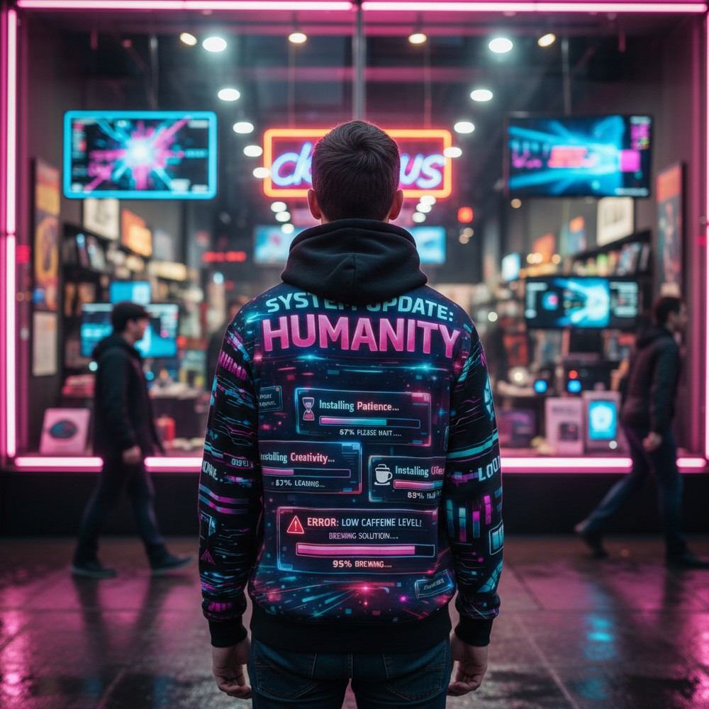 Niektóre aktualizacje nigdy się nie kończą. HUMAN STILL BETA to bluza dla tych, którzy wiedzą, że człowiek – tak jak technologia – cały czas się rozwija, uczy i przechodzi kolejne wersje. Na froncie tego futurystycznego pancerza cyfrowej tożsamości pojawia się motyw technologicznego interfejsu z napisem HUMAN STILL BETA oraz neonową grafiką inspirowaną światem AI. Całość wygląda jak ekran systemowy przyszłości, w którym człowiek i technologia zaczynają działać na wspólnych zasadach. Tył bluzy rozwija tę koncepcję w formie cyfrowego panelu aktualizacji. Wśród neonowych interfejsów i ikon pojawia się hasło SYSTEM UPDATE: HUMANITY, które wygląda jak komunikat z przyszłości przypominający, że rozwój człowieka wciąż trwa. Miękka materiał, kaptur i wygodny krój sprawiają, że ten pancerz technologicznego dystansu idealnie sprawdza się w codziennym stylu, szczególnie dla tych, którzy lubią futurystyczny klimat i inteligentny humor.