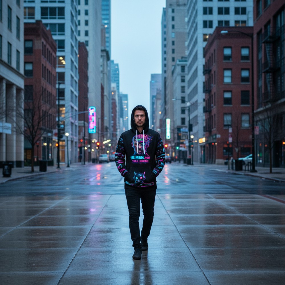 Bluza męska z kapturem HUMAN STILL BETA od DK Syndicate to futurystyczny streetwear inspirowany światem AI i technologii. Neonowa grafika z motywem „system update: humanity” łączy cyfrowy humor z nowoczesnym stylem miejskim. Wygodna, miękka i wyrazista – idealna dla fanów technologii, gamingu i klimatu cyberpunk.