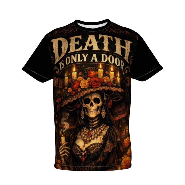 Niektóre symbole śmierci nie oznaczają końca, ale przejście do czegoś nowego. LOS MUERTOS to koszulka inspirowana klimatem Día de los Muertos oraz barwną symboliką życia, śmierci i pamięci. Na froncie tego pancerza kulturowej energii pojawia się wyrazista postać szkieletu w bogato zdobionym, tradycyjnym stylu. Intensywne kolory, ornamenty i detale nawiązują do meksykańskiej estetyki święta zmarłych, gdzie śmierć ukazywana jest w artystyczny i symboliczny sposób. Hasło „Death is only a door” podkreśla filozofię przejścia i ciągłości, nadając projektowi głębszy, refleksyjny charakter. Tył koszulki utrzymany jest w minimalistycznej, czarnej estetyce, co pozwala w pełni skupić uwagę na mocnym froncie. Lekki materiał i wygodny krój sprawiają, że ten pancerz symbolicznego stylu idealnie sprawdza się w codziennych stylizacjach dla osób, które lubią wyrazistą grafikę i kulturową głębię.