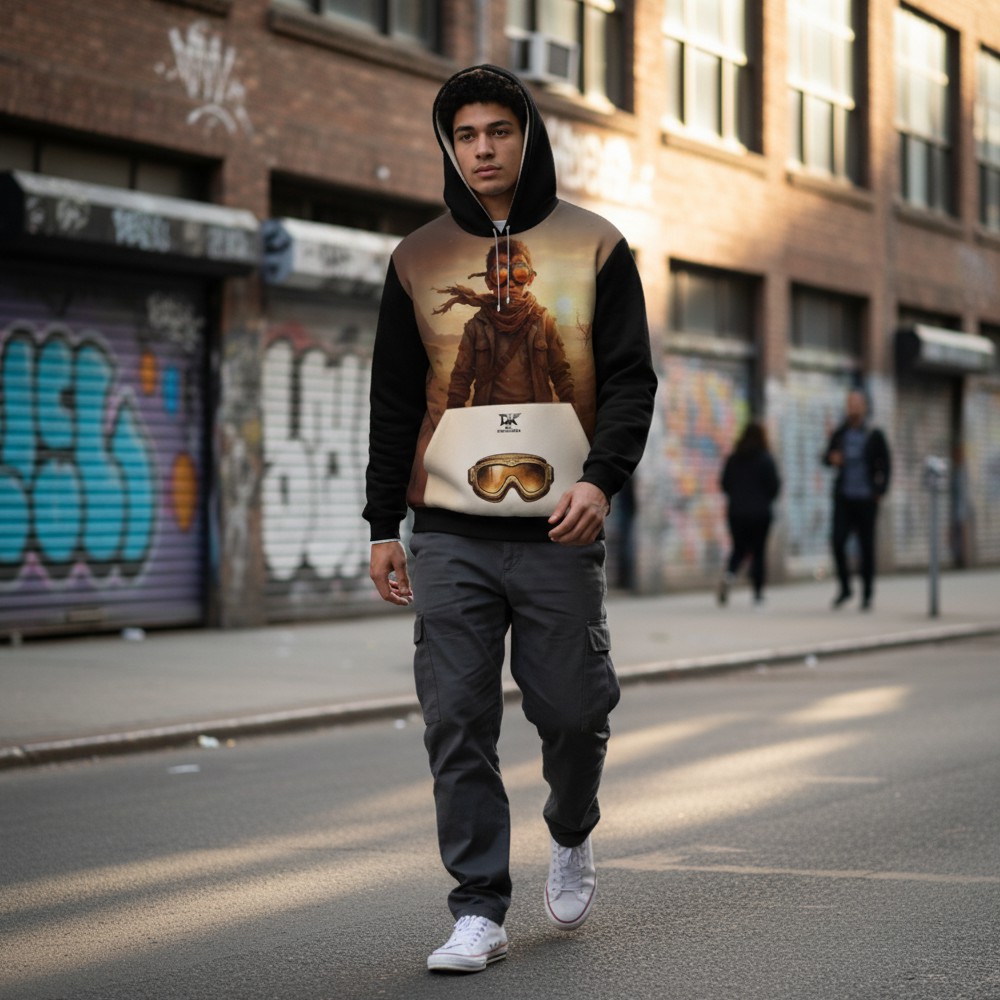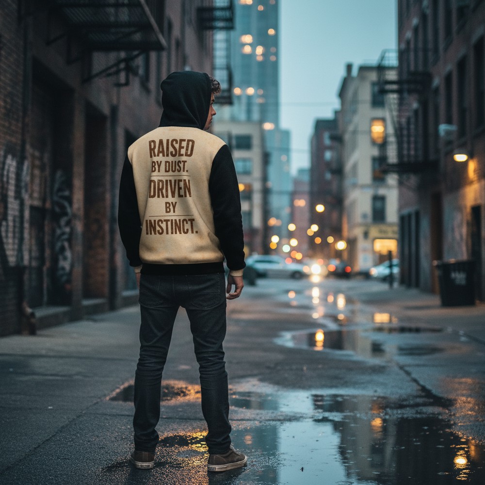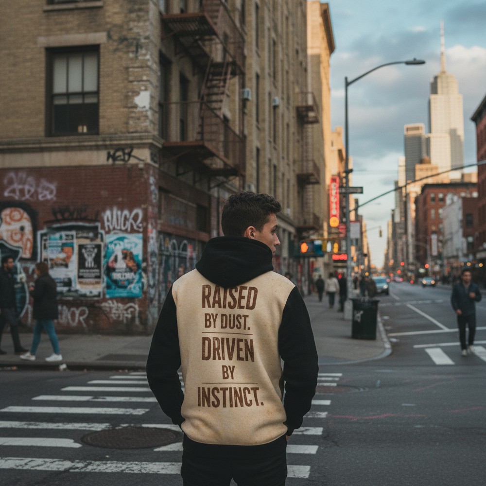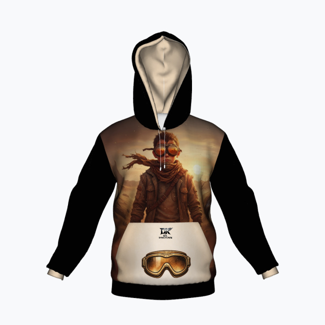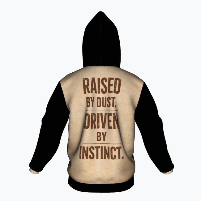 Niektóre historie rodzą się w ciszy pustyni. RAISED BY DUST to bluza inspirowana surową siłą natury, niezależnością i instynktem, który prowadzi naprzód bez zbędnych słów. Na froncie pojawia się postać samotnego wojownika w klimacie pustynnego krajobrazu, otoczona ciepłym światłem zachodzącego słońca. Minimalistyczna kompozycja podkreśla charakter podróżnika, który idzie własną drogą. Tył bluzy wzmacnia przekaz mocnym hasłem: RAISED BY DUST