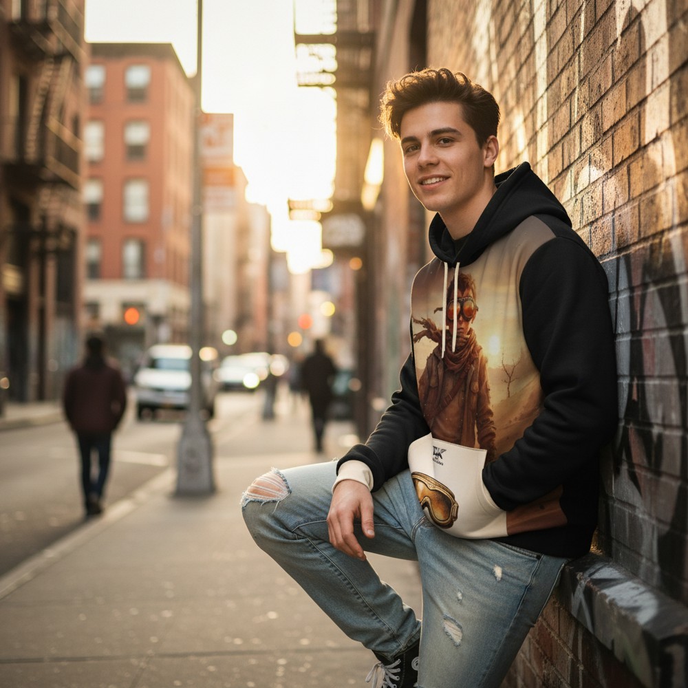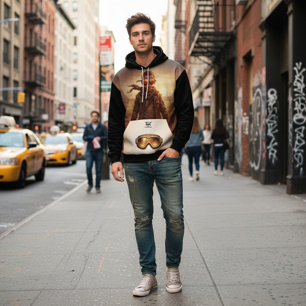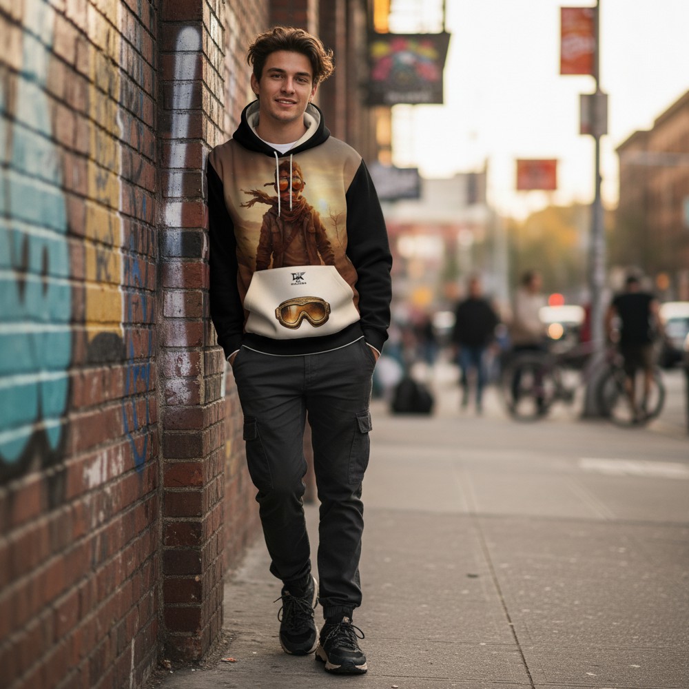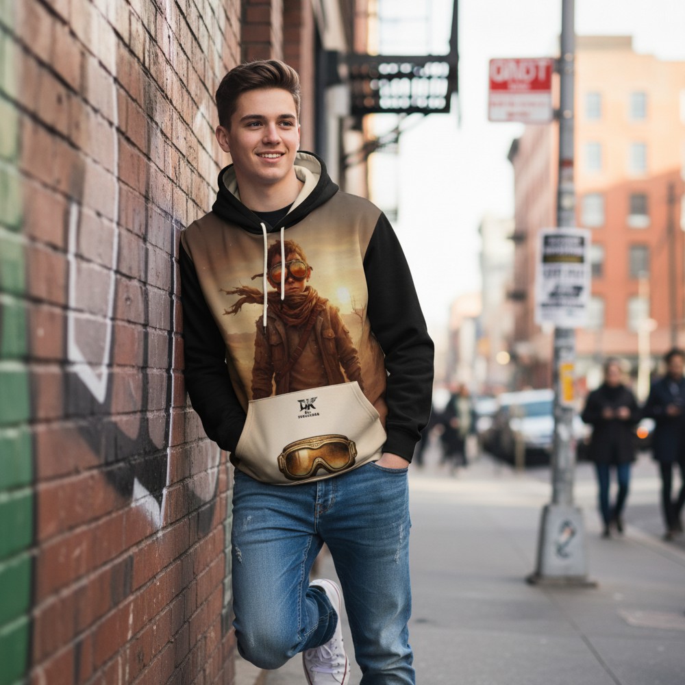 Niektóre historie rodzą się w ciszy pustyni. RAISED BY DUST to bluza inspirowana surową siłą natury, niezależnością i instynktem, który prowadzi naprzód bez zbędnych słów. Na froncie pojawia się postać samotnego wojownika w klimacie pustynnego krajobrazu, otoczona ciepłym światłem zachodzącego słońca. Minimalistyczna kompozycja podkreśla charakter podróżnika, który idzie własną drogą. Tył bluzy wzmacnia przekaz mocnym hasłem: RAISED BY DUST