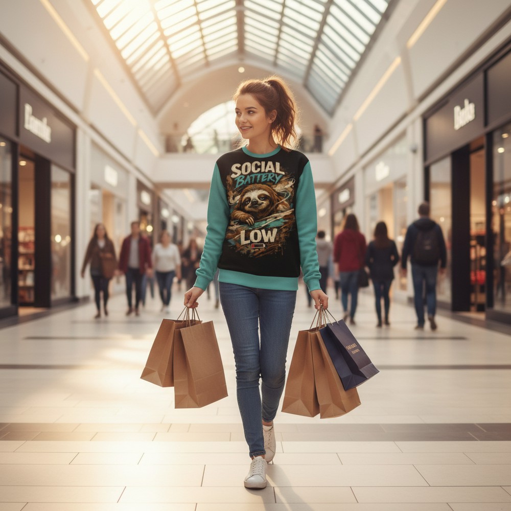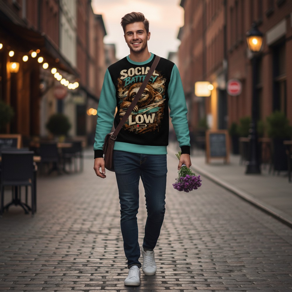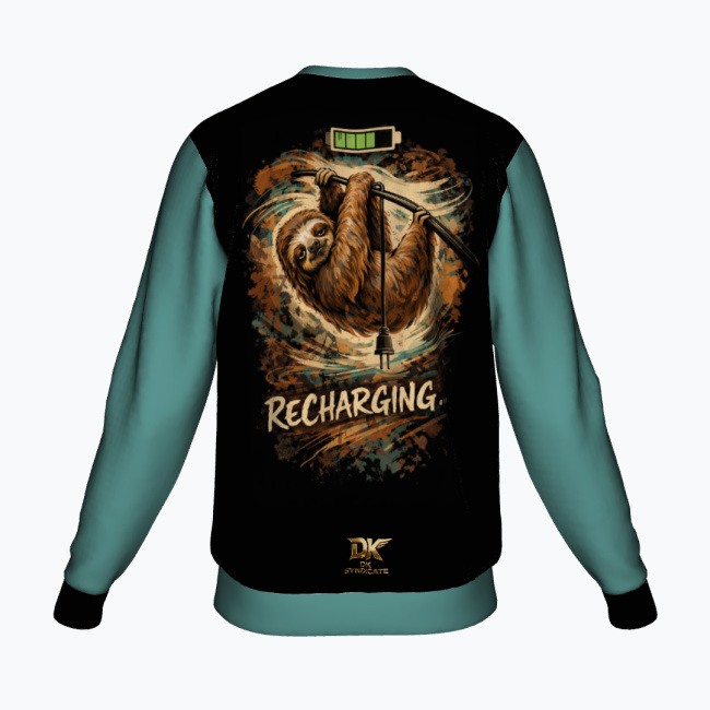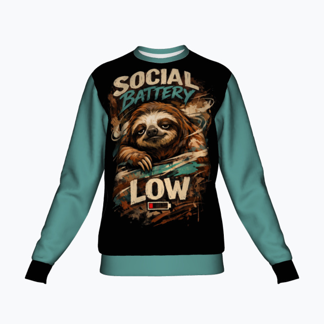 Bluza SOCIAL BATTERY LOW od DK Syndicate z humorystycznym motywem leniwca. Full color sublimation print zapewnia wysoką szczegółowość i trwałość nadruku. Styl streetwear z dystansem.