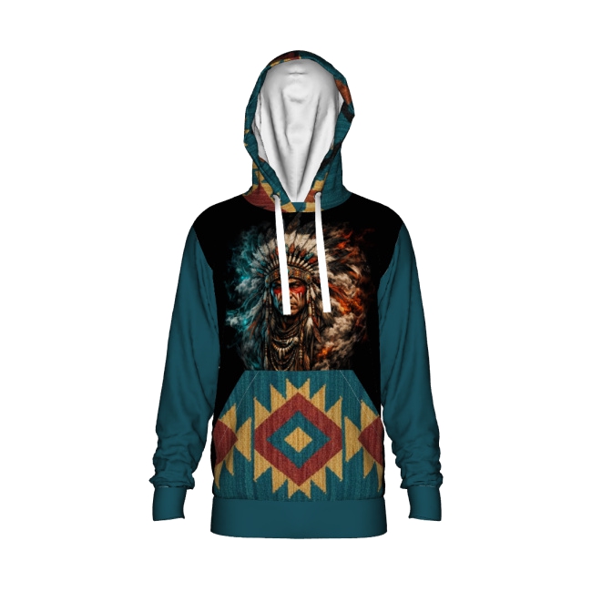 Wizualna Symfonia Tradycji: Front bluzy zdobi portret wodza wyłaniającego się z mistycznej mgły, uzupełniony o kieszeń typu kangurka z potężnym, geometrycznym wzorem etnicznym. Tył pancerza to epicka wizualizacja siły – detaliczny portret wojownika w pióropuszu, skąpany w kontrastowym świetle ognia i lodu, zwieńczony symbolem orła oraz złotym logotypem DK SYNDICATE. Całość domyka kaptur w pełni pokryty tradycyjnym splotem graficznym, tworząc spójną i niepowtarzalną bryłę.