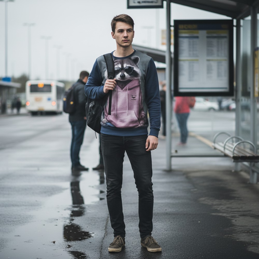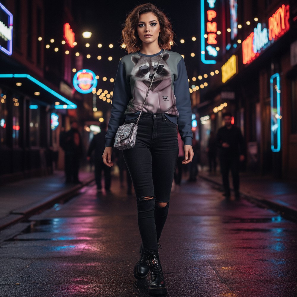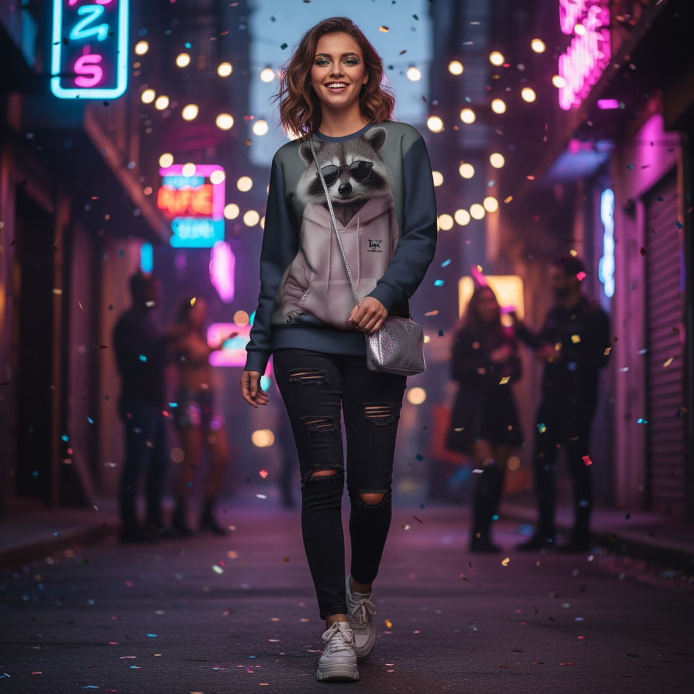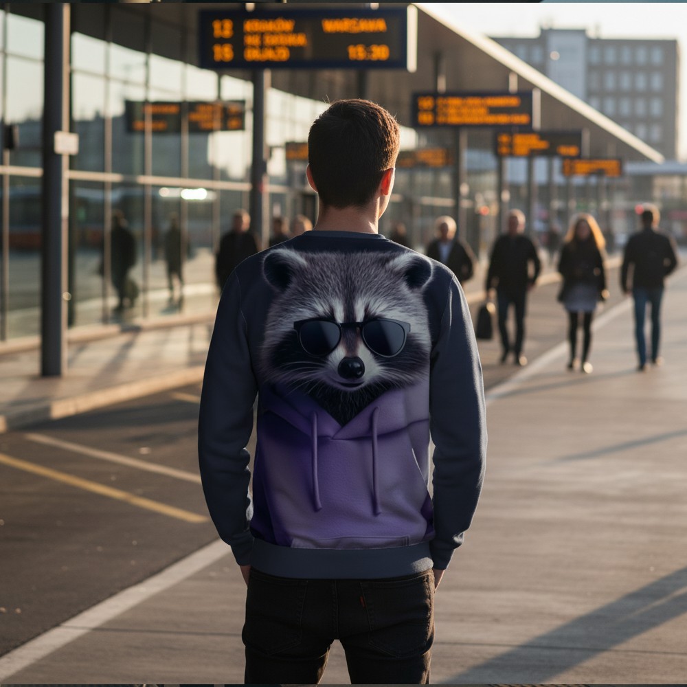Niektóre postacie najlepiej czują się po zmroku. STREET RACCOON to bluza dla tych, którzy wiedzą, że miejski styl zaczyna się od pewności siebie i odrobiny nocnej energii. Na froncie tego miejskiego pancerza ulicznego stylu pojawia się szop w ciemnych okularach i luźnej bluzie, wyglądający jak prawdziwy bohater nocnego miasta. Minimalistyczna, ale wyrazista grafika nadaje całości charakter spokojnej pewności siebie — jak ktoś, kto dokładnie wie, gdzie w mieście dzieje się najwięcej. Tył bluzy rozwija tę historię jeszcze bardziej. Duży portret szopa w okularach i ulicznej stylizacji wygląda jak symbol miejskiej niezależności, a chłodne kolory i realistyczna grafika tworzą klimat nocnej sceny. Miękki materiał i wygodny krój sprawiają, że ten pancerz miejskiego chilloutu świetnie sprawdza się w codziennym użytkowaniu — od spacerów po mieście po luźne spotkania ze znajomymi.