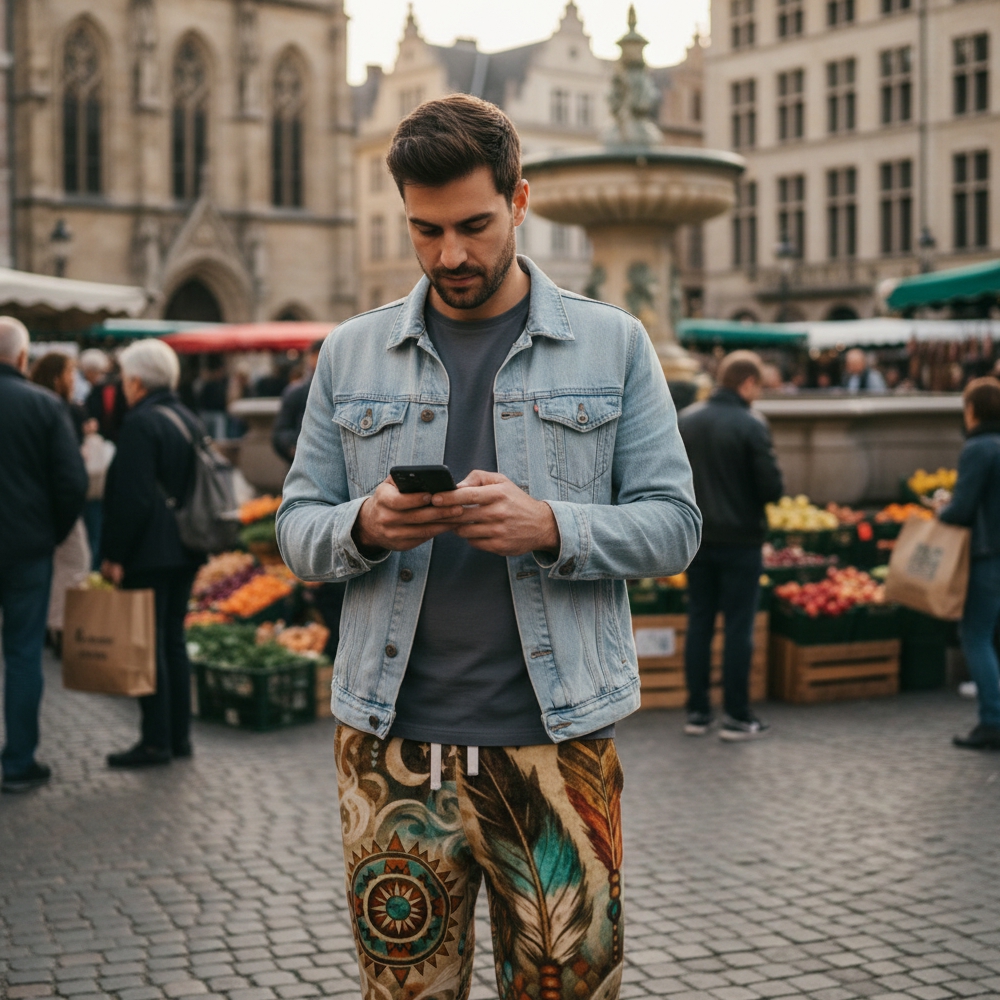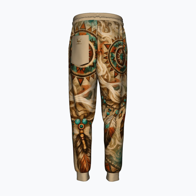 Mistyczna Kompozycja Wizualna: Cała powierzchnia spodni jest pokryta złożonym splotem piór, księżyców oraz geometrycznych słońc w odcieniach turkusu i spalonej pomarańczy. Tło w kolorze postarzanego pergaminu nadaje całości charakteru dawnego rynsztunku, który został odnaleziony i wdrożony do Twojego arsenału.