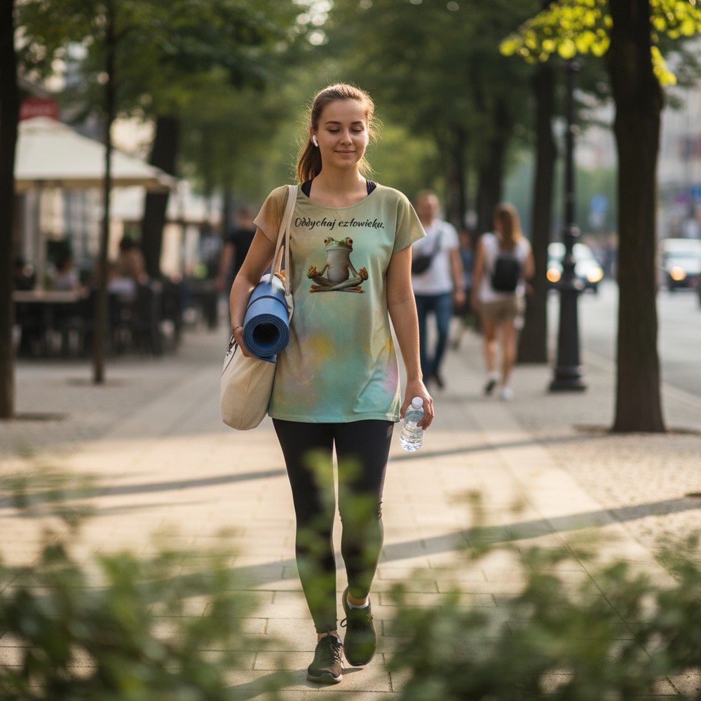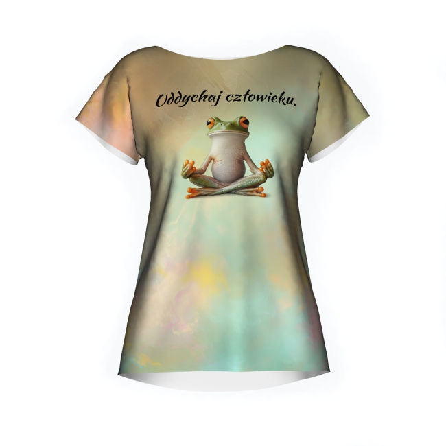 W świecie zdominowanym przez dane i ciągły pośpiech, najtrudniejszą umiejętnością jest odpuszczenie. Koszulka damska typu butterfly "ZEN VIBES" została stworzona, by wspierać Cię w procesie rekalibracji własnej energii. Unikalna grafika z żabą w pozycji lotosu oraz wymowne hasło „Oddychaj człowieku.” to Twój osobisty firewall przeciwko stresowi. Luźny, swobodny krój typu butterfly zapewnia przepływ powietrza i absolutny komfort, a pastelowa kolorystyka w odcieniach mglistego turkusu i piaskowego złota łagodzi wizualne napięcia. To pancerz dla nowoczesnych mistrzyń mindfulness, które wiedzą, że największa siła drzemie w ciszy.